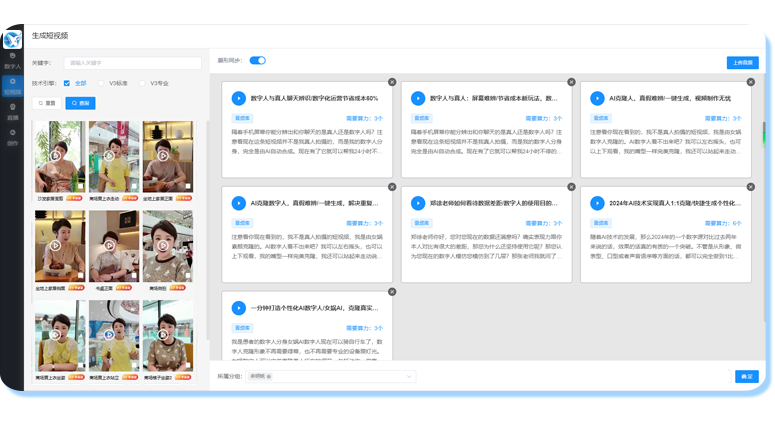 采用全新一代V4.0数字人大模型技术,只需自助上传一段1分钟的视频,无需专业的灯光与设备、可绿幕、可实景、可静坐、可走动跑步等形象素材!系统即可快速帮你克隆一个仿真度高达99%的数字人分身