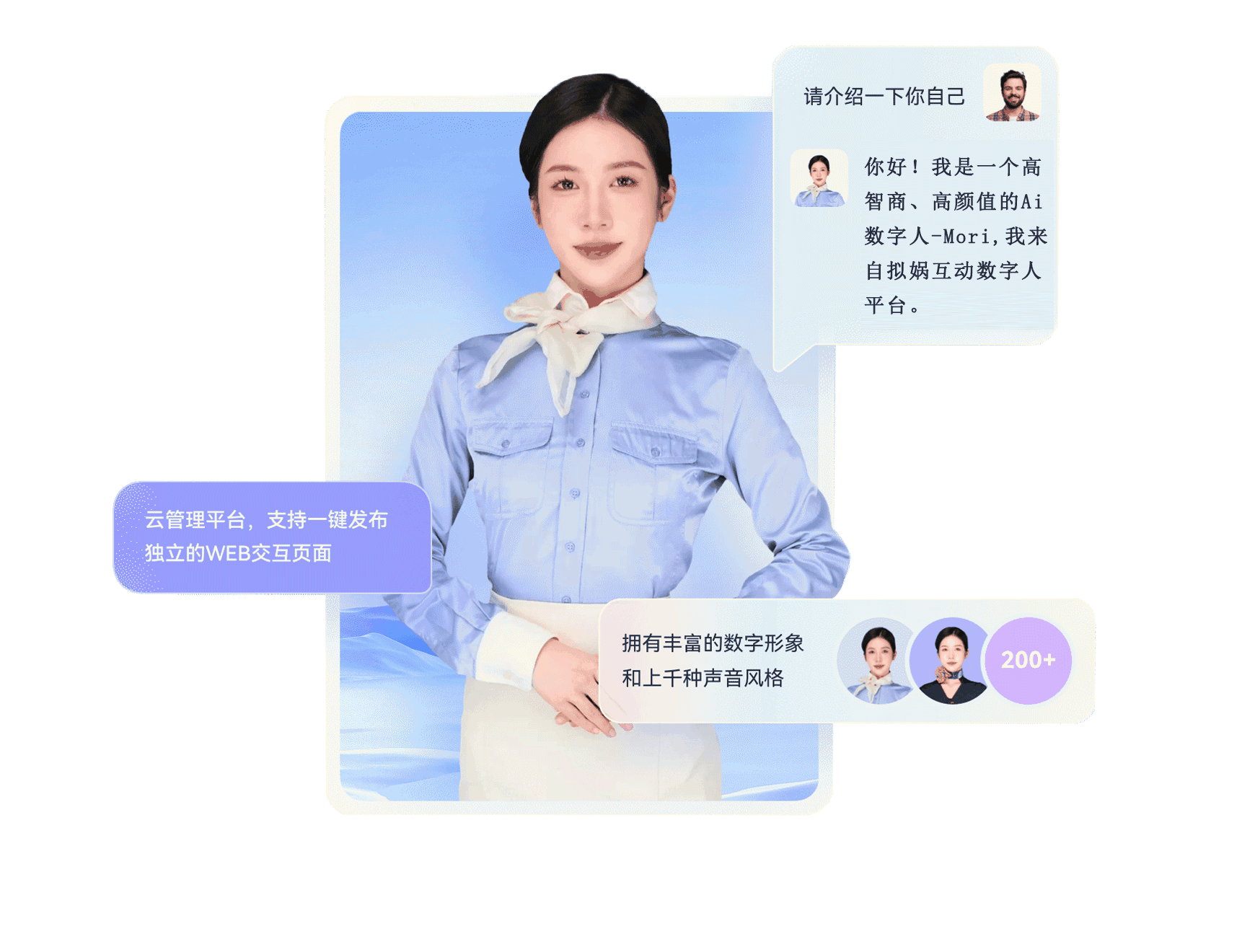 基于AIGC数字人V4.0大模型,自研形象和声音快速复刻技术,快速一键打造属于你的高仿真、多态感知、全实景的高端数字人克隆分身。